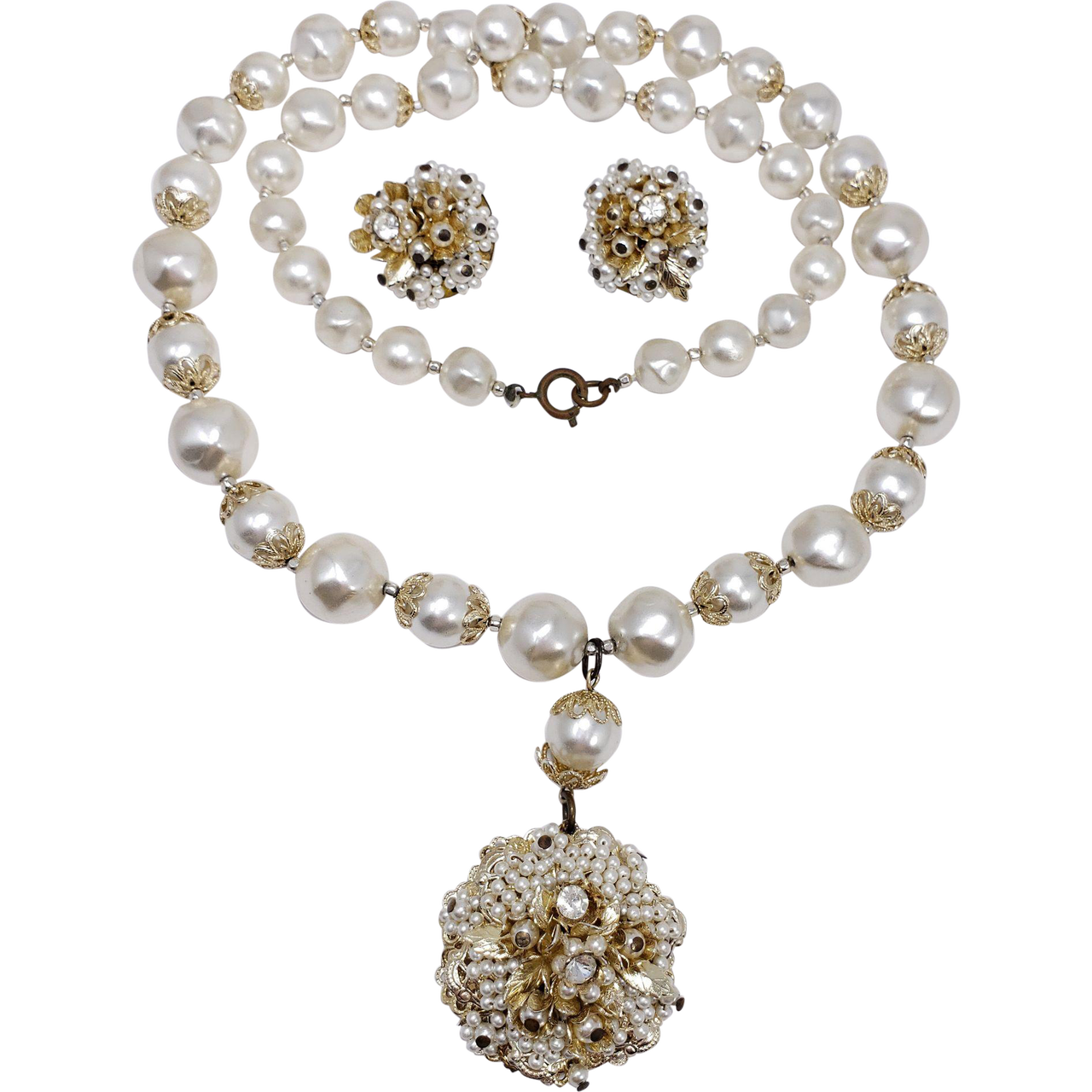 A luxurious and regal-looking set of a pair of clip on earrings and matching necklace. The necklace features graduated faux pearls, accented with stylish gold accents (filigree caps). The floral-themed pendant features a cluster of flowers adorned with small faux pearls and clear crystals. The matching earrings mimic the design of the pendant for an exquisite look!