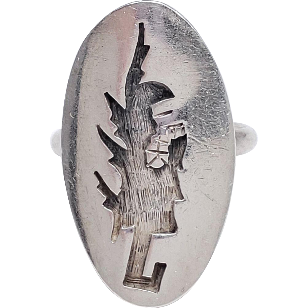 A Native American sterling silver ring. The face has an abstract tree-like motif. Expertly hand made by Native American silversmiths.