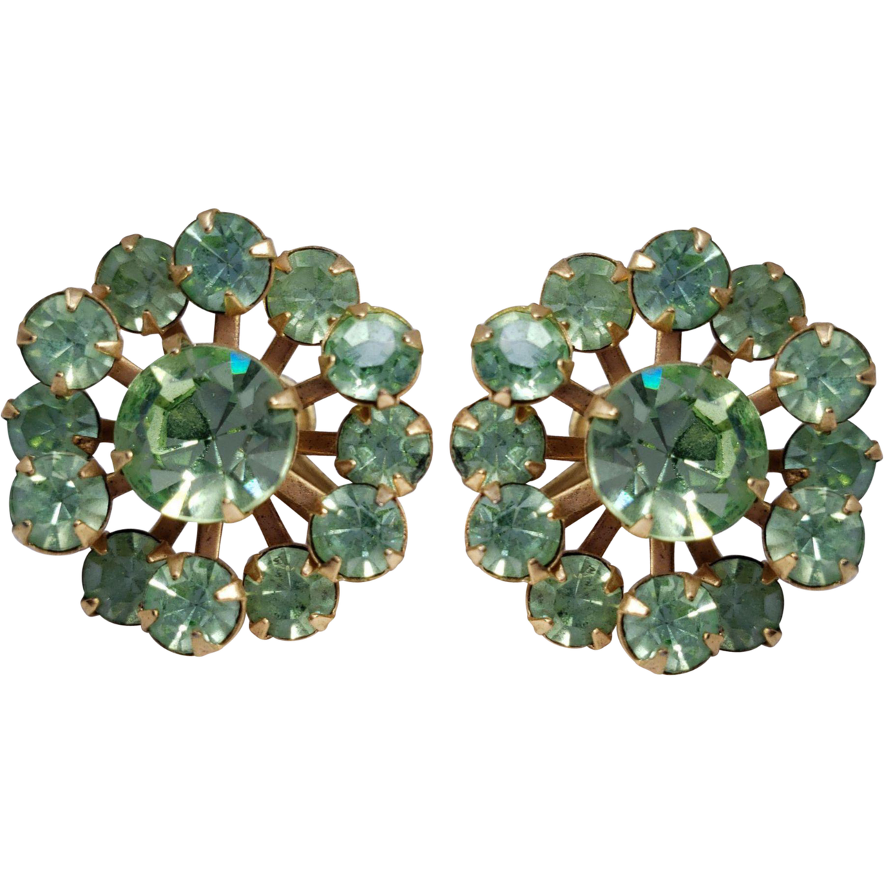 Gorgeous vintage screw back dangle earrings are set with round green stones