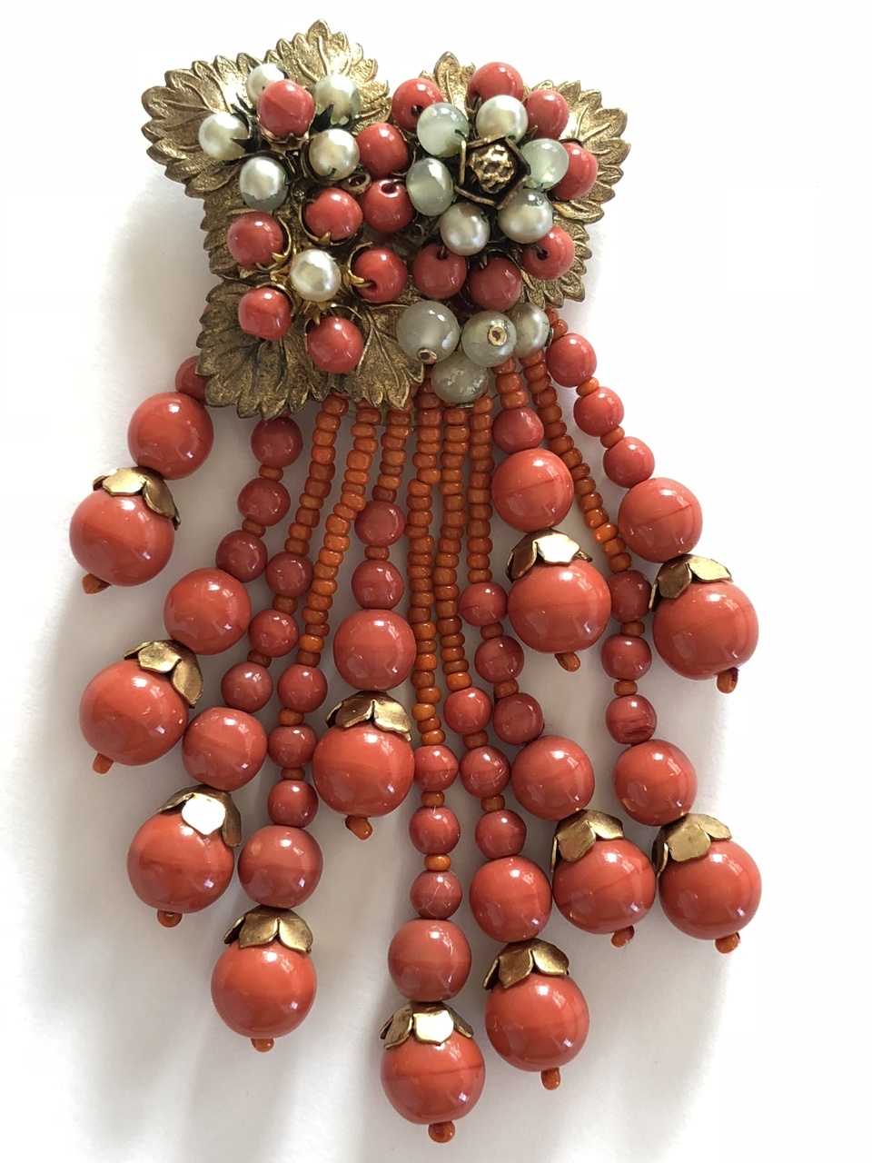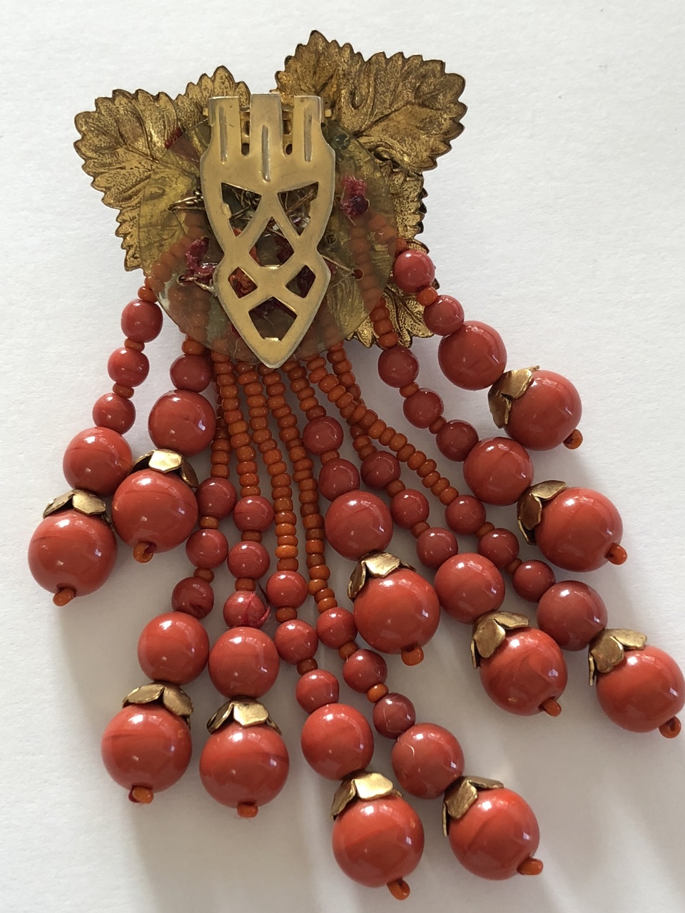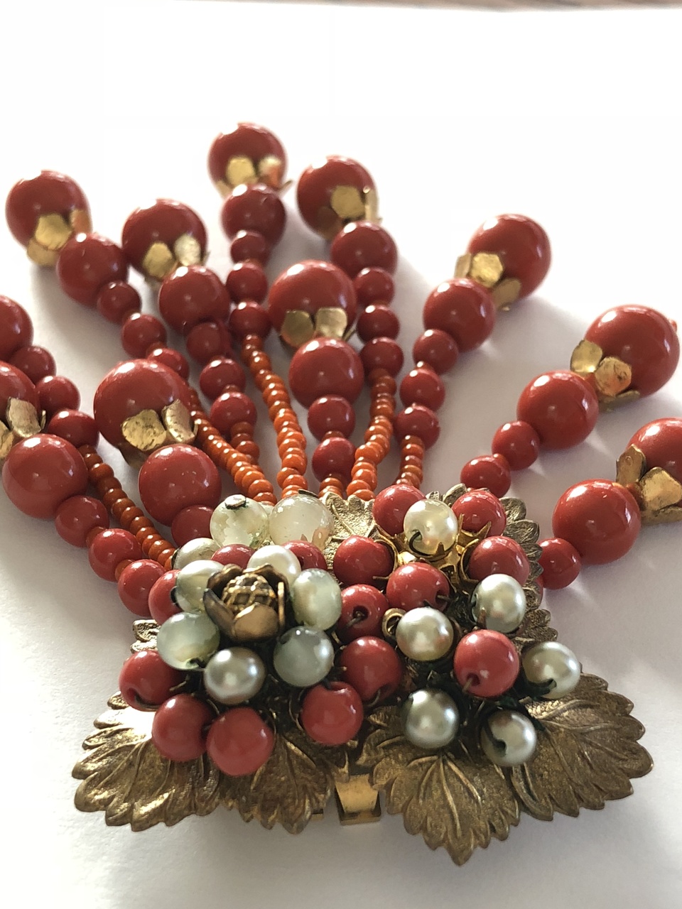 Miriam Haskell Frank Hess early unsigned orange glass bead wreath shaped dress clip with gold tone florets leaf motif center and faux pearl. The peace measures approx. 4” x 2”. The condition is very fine with the only thing to note being some finish loss to the pearls.