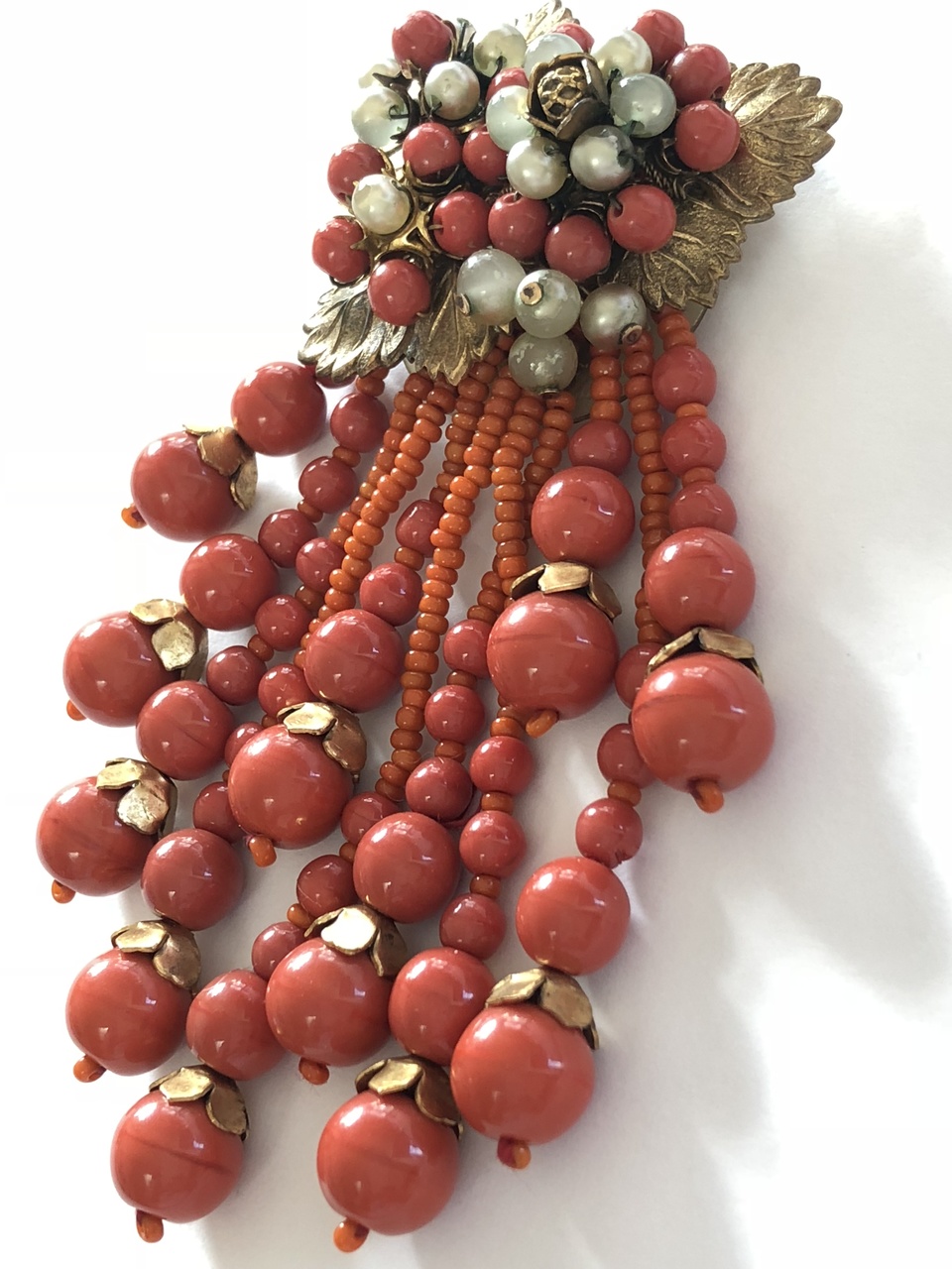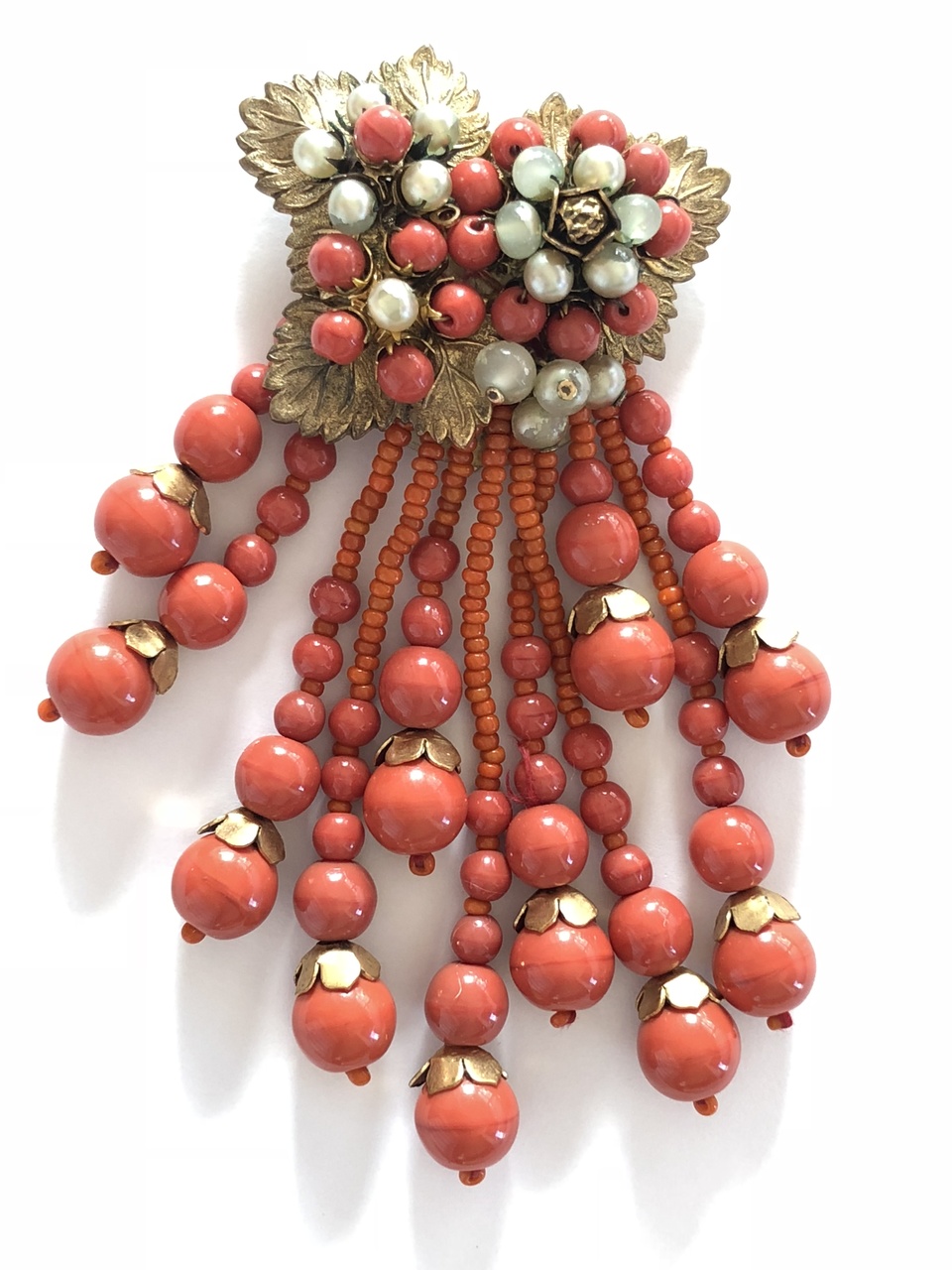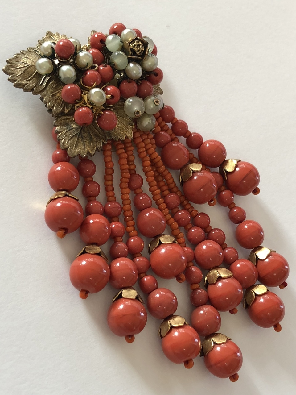 Miriam Haskell Frank Hess early unsigned orange glass bead wreath shaped dress clip with gold tone florets leaf motif center and faux pearl. The peace measures approx. 4” x 2”. The condition is very fine with the only thing to note being some finish loss to the pearls.