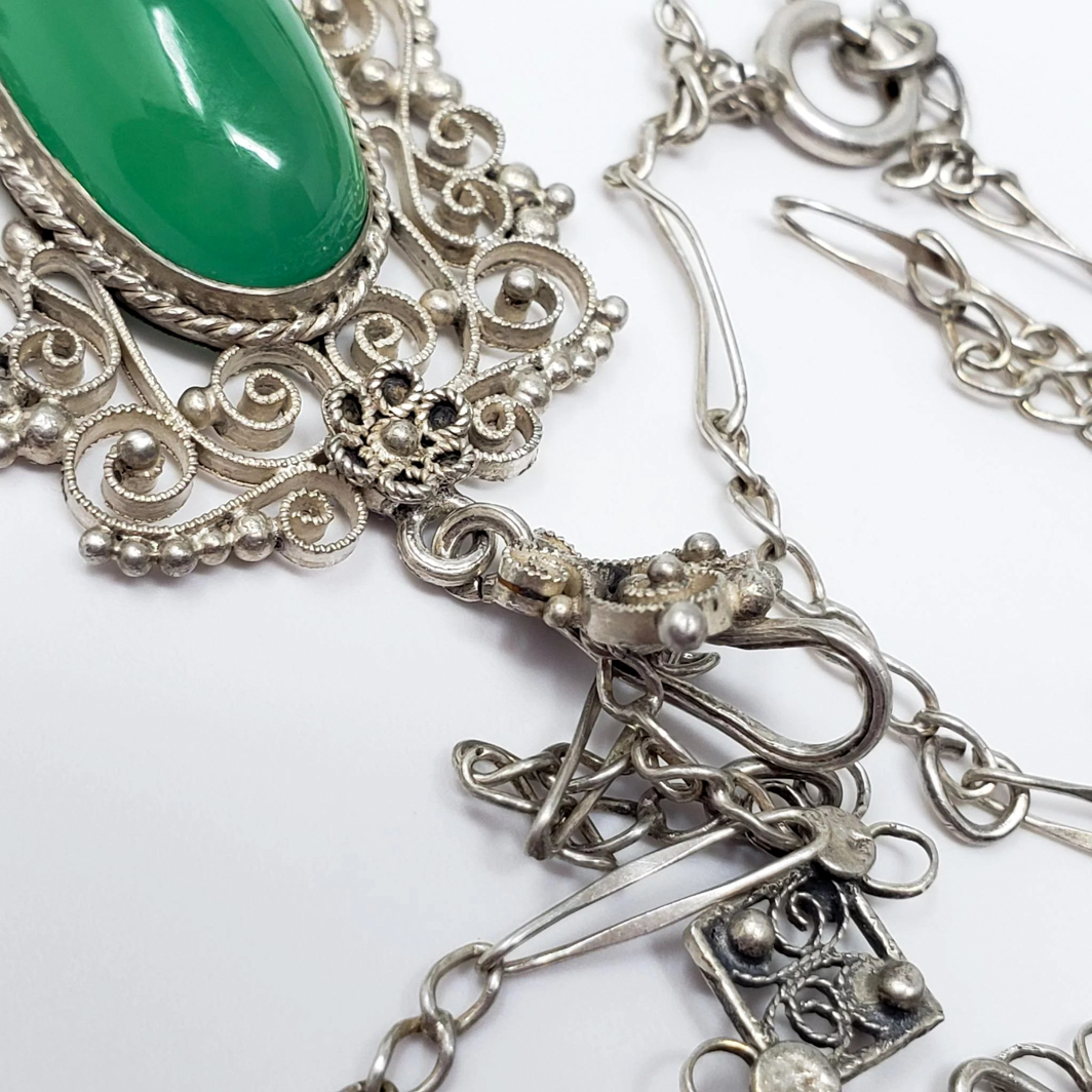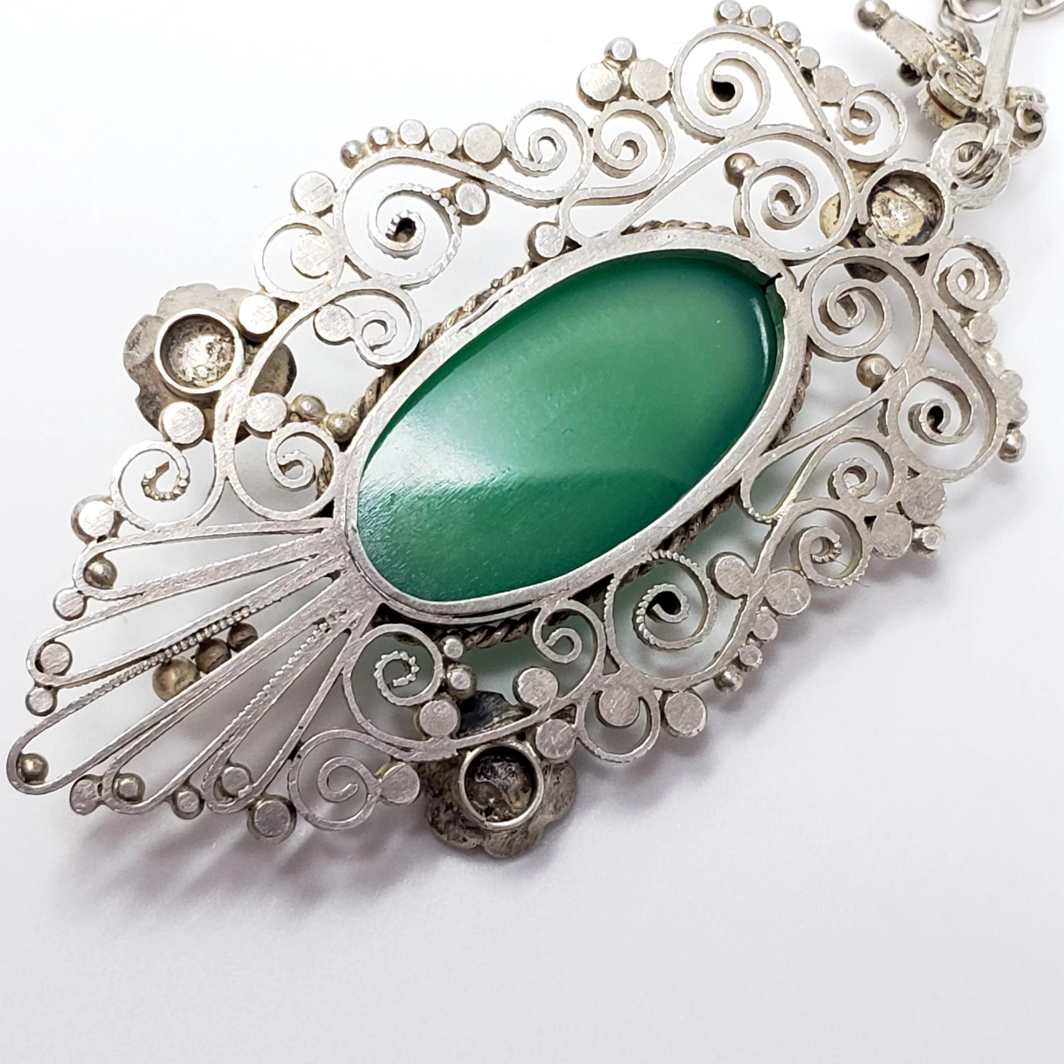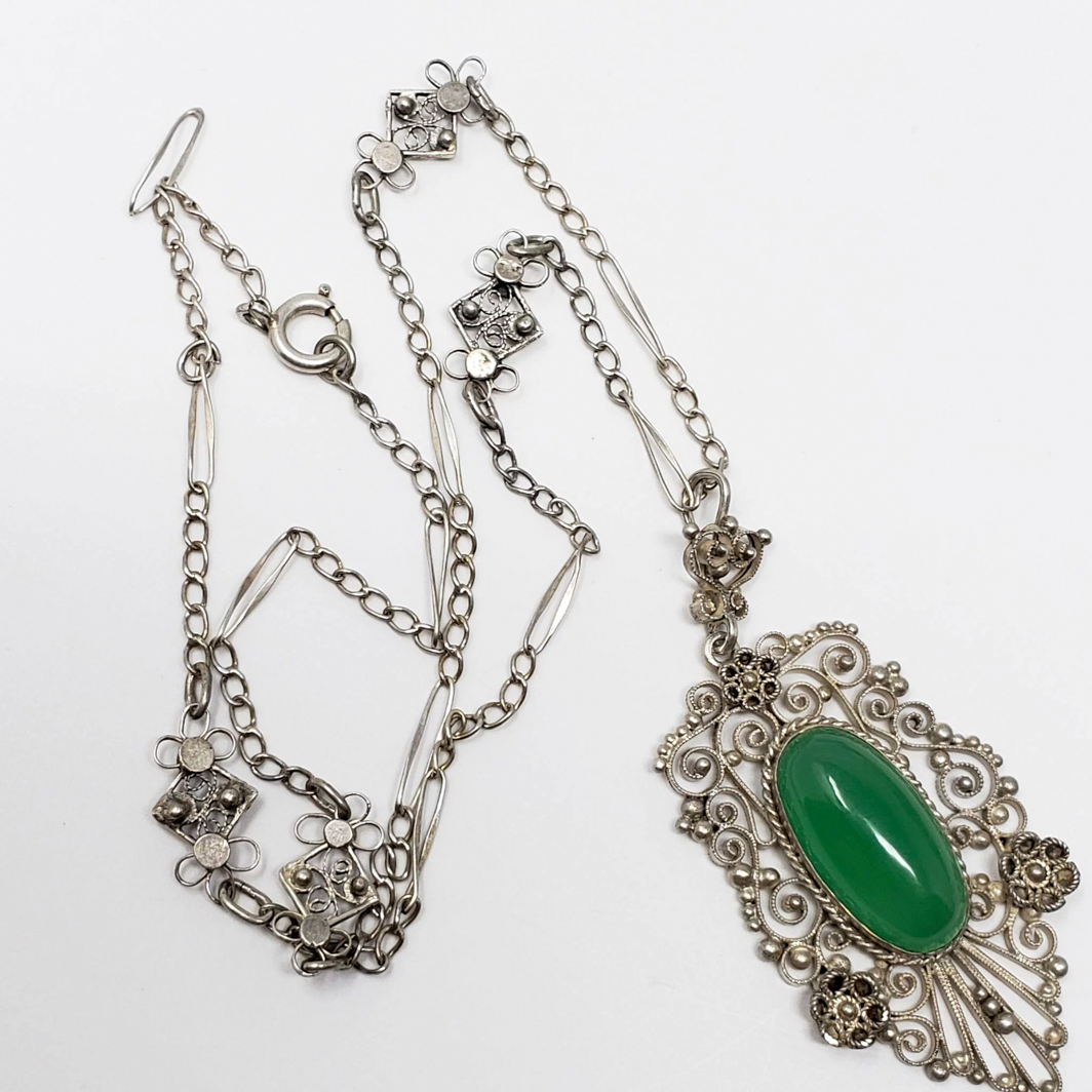 A vintage art nouveau pendant / necklace, circa 1900. Mesmerizing translucent green cabochon art glass nested in an accented silver filigree setting. The pendant hangs on a fine silver chain. A fancy nouveau design.