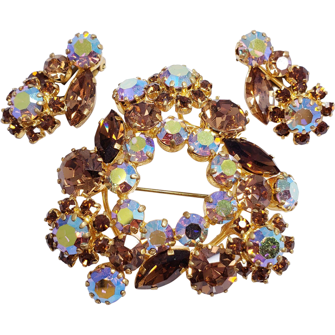 A matching set which includes a floral wreath-shaped pin/pendant and a pair of clip-on earrings. Both are decorated with Austrian prong-set crystals in icy aurora borealis and amber colors.